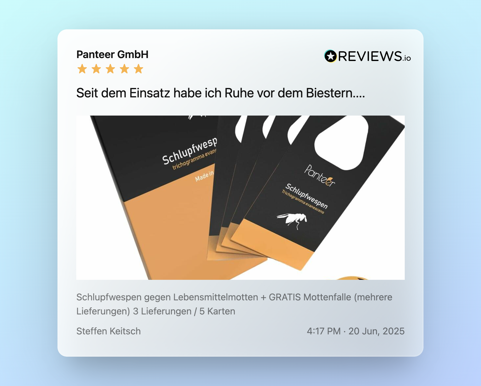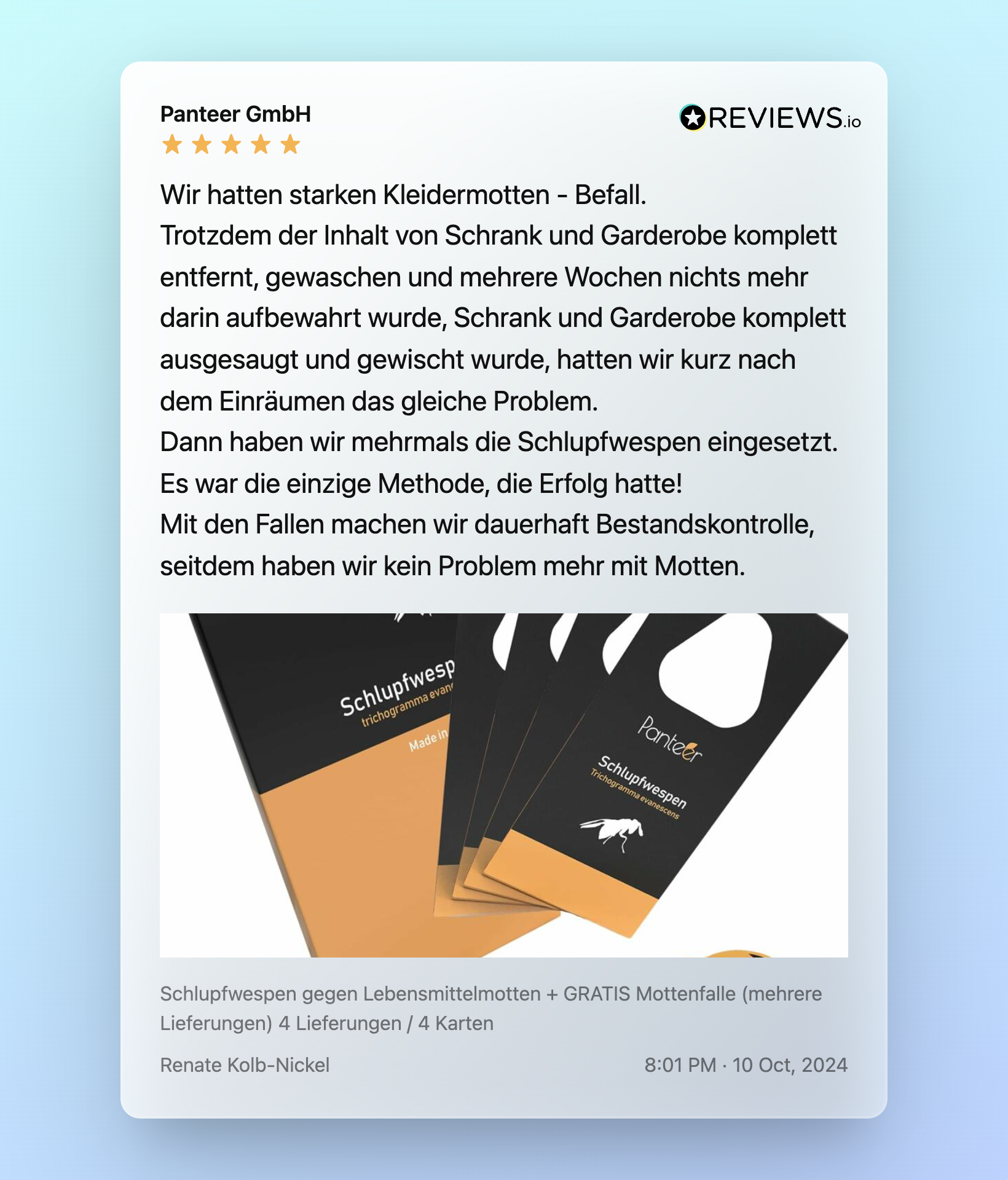 - 🔄 Ja – Schlupfwespen sollten je nach Entwicklungszyklus 3–6 Mal geliefert werden. Duftschutz & Fallen alle 4–6 Wochen wechseln.