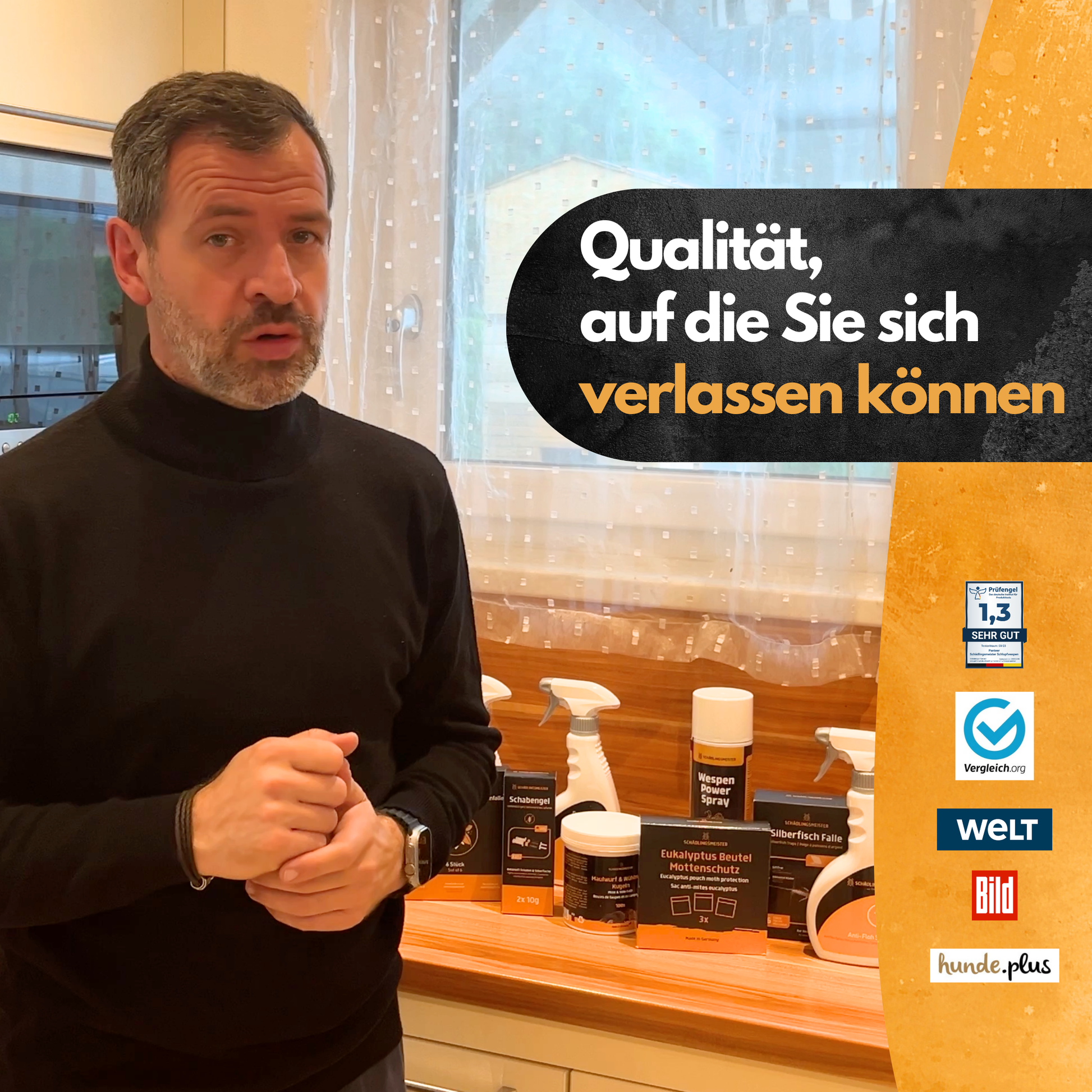 - 📦 MADE IN GERMANY – Hergestellt unter höchsten Qualitätsstandards mit Wirkstoffen wie Chrysanthemum-cinerariaefolium-Extrakt und Zitroneneukalyptusöl. Zulassung als PT19-Abwehrmittel. Vor Gebrauch stets Etikett und Produkt-informationen lesen. Biozidprodukte vorsichtig verwenden. BAUA: N-115791